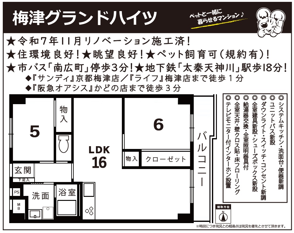 梅津グランドハイツ ★令和7年11月リノベーション★ペットと一緒に暮らせるマンション 2,180 万円 所在地:京都市右京区梅津南広町 構造:RC造8階建5階部分 号数:525号室 専有面積:61.75㎡ バルコニー:6.89㎡ 間取り:2LDK 管理費:6150円/月 修繕積立金:6820円/月 建築年月:1979年(昭和54年)5月 現況:空室 明け渡し:即時 総戸数:204戸 管理形態:委託管理 学区:葛野小学校(約720m)/西京極中学校(約1940m) 備考:自治会費400円/月 ペット飼育可能(規約有) この物件のお問い合せ この物件のお問い合せを希望の方は、下の送信フォームに必要事項をご入力の上、送信をお願いいたします。後ほど担当者よりご連絡差し上げますので、お気軽に何なりとご相談ください。 物件名: 『梅津グランドハイツ』 お名前 [必須] フリガナ [必須] メールアドレス [必須] お電話番号 お問い合わせ内容
