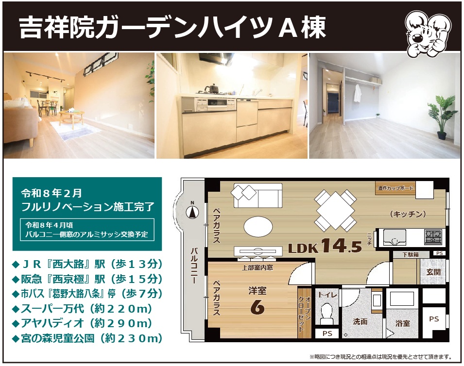吉祥院ガーデンハイツA棟/3階部分 ★令和8年2月フルリノベーション施工のお部屋★即入居可能 1,480 万円 所在地:京都市南区吉祥院西ノ庄向田町 交通:JR「西大路」駅歩13分 阪急「西京極」駅歩15分 市バス「葛野大路八条」停歩7分 構造:RC造7階建3階部分 号数:313号室 専有面積:44.00㎡ バルコニー:6.74㎡ 間取り:1LDK 管理費:4850円/月 修繕積立金:7900円/月 建築:1974年(昭和49年)3月 現況:空室 明け渡し:即時 総戸数:413戸 管理形態:委託管理 学区:祥豊小学校(約950m)/洛南中学校(約2080m) この物件のお問い合せ この物件のお問い合せを希望の方は、下の送信フォームに必要事項をご入力の上、送信をお願いいたします。後ほど担当者よりご連絡差し上げますので、お気軽に何なりとご相談ください。 物件名: 『吉祥院ガーデンハイツA棟/3階部分』 お名前 [必須] フリガナ [必須] メールアドレス [必須] お電話番号 お問い合わせ内容